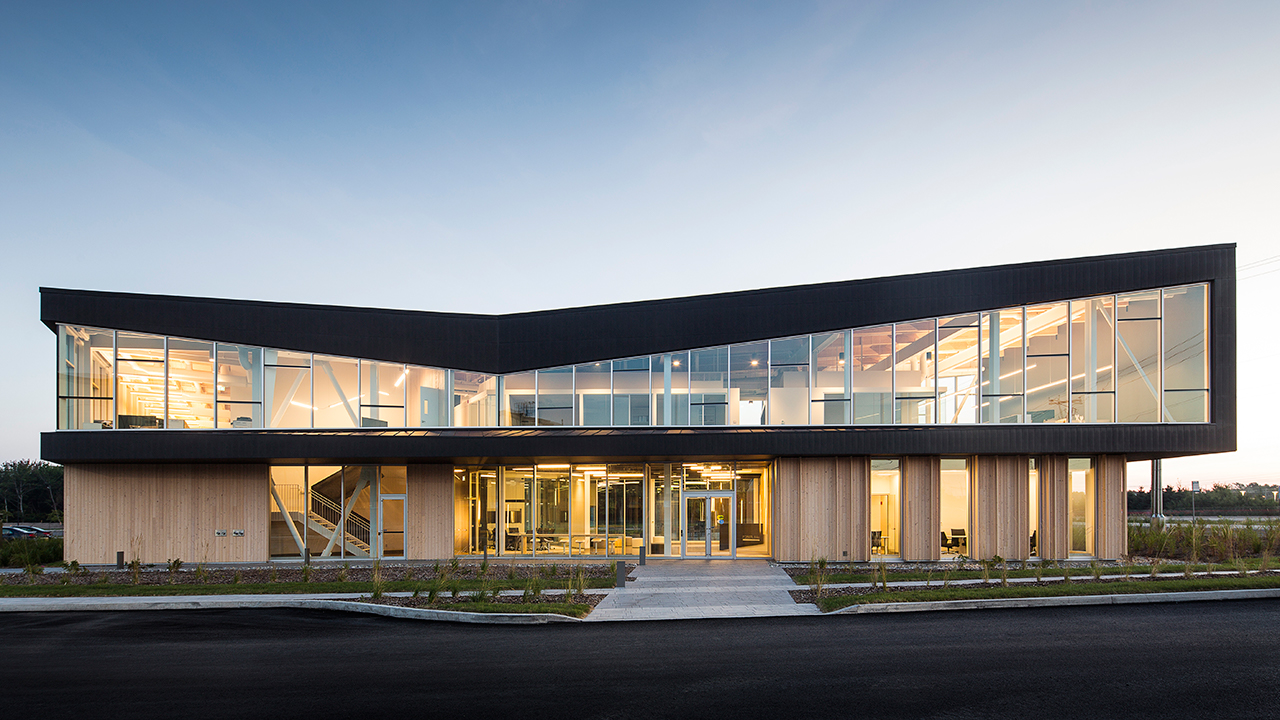 La portion avant est quant à elle composée d’un imposant volume au deuxième niveau qui se dresse en de multiples porte-à-faux s’affirmant, d’une part, telle une marquise faisant office de seuil à l’entrée principale de l’édifice et, d’autre part, tel un élément signalétique fort dans le paysage adjacent à une autoroute. Les désaxements et l’amplitude de ce volume contrastent avec l’aile rectangulaire se dressant à l’arrière du site.