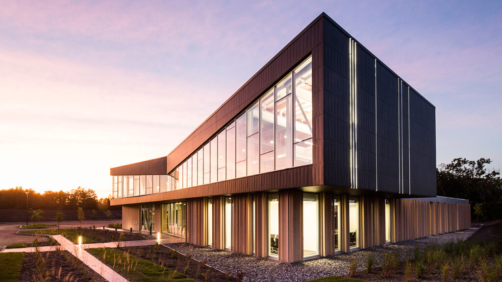 Le bâtiment se déploie autour d’un boisé existant depuis sa façade principale offrant ainsi un écrin d’intimité à une cour intérieure protégée du bruit autoroutier et des activités industrielles adjacentes. L’articulation du projet permet de valoriser le milieu naturel existant tout en créant un pôle central afin de favoriser la cohésion entre les différents usagers du bâtiment.