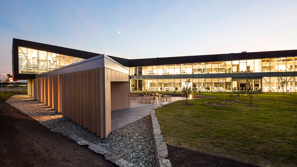 Le grand volume de bois qui abrite les salles de conférence et la cafétéria crée une cour intérieure. Ce volume d’un étage recouvert d’une toiture végétale procure au lieu une intimité par rapport au contexte autoroutier ainsi qu’un fort contact avec le boisé existant. Générant de bonnes portées afin de libérer au maximum l’espace de la cafétéria, la structure d’acier apparente participe à la composition de l’environnement intérieur. L’aménagement d’une terrasse extérieure prolonge cet espace rassembleur.
