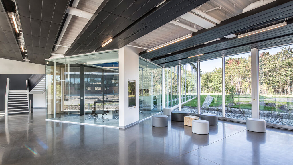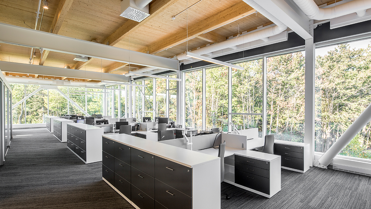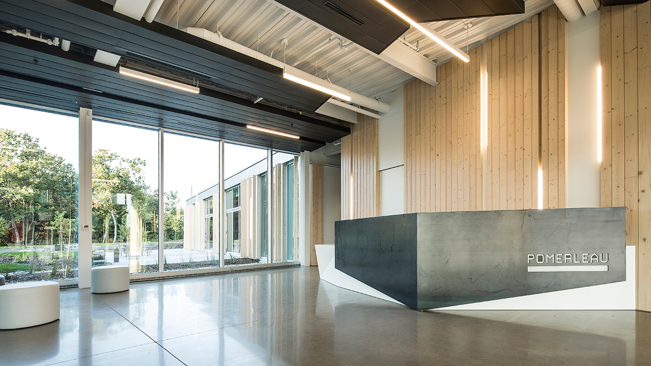 La mise en valeur de matériaux bruts, tels que le béton poli pour les planchers du hall et de la cafétéria, les plaques d’acier brut pour le mobilier de réception et les garde-corps, le pin naturel pour les parements extérieurs et intérieurs, ainsi que la charpente dénudée en bois et en acier, vient souligner l’esprit de bâtisseur de Pomerleau.