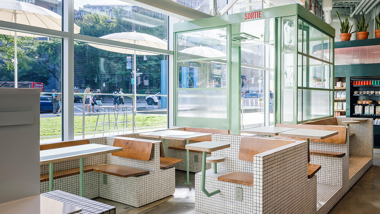 L’étroitesse de l’espace a dicté la conception et l’intégration du mobilier. Le défi d’aménager 24 places assises a mené à une approche tables-banquettes conciliant fonctionnalité et convivialité. Elle attribue aussi au mobilier un second rôle : définir de manière épurée et tranchée, les aires d’expériences (espace des commandes, comptoirs à emporter, surface de consommation).