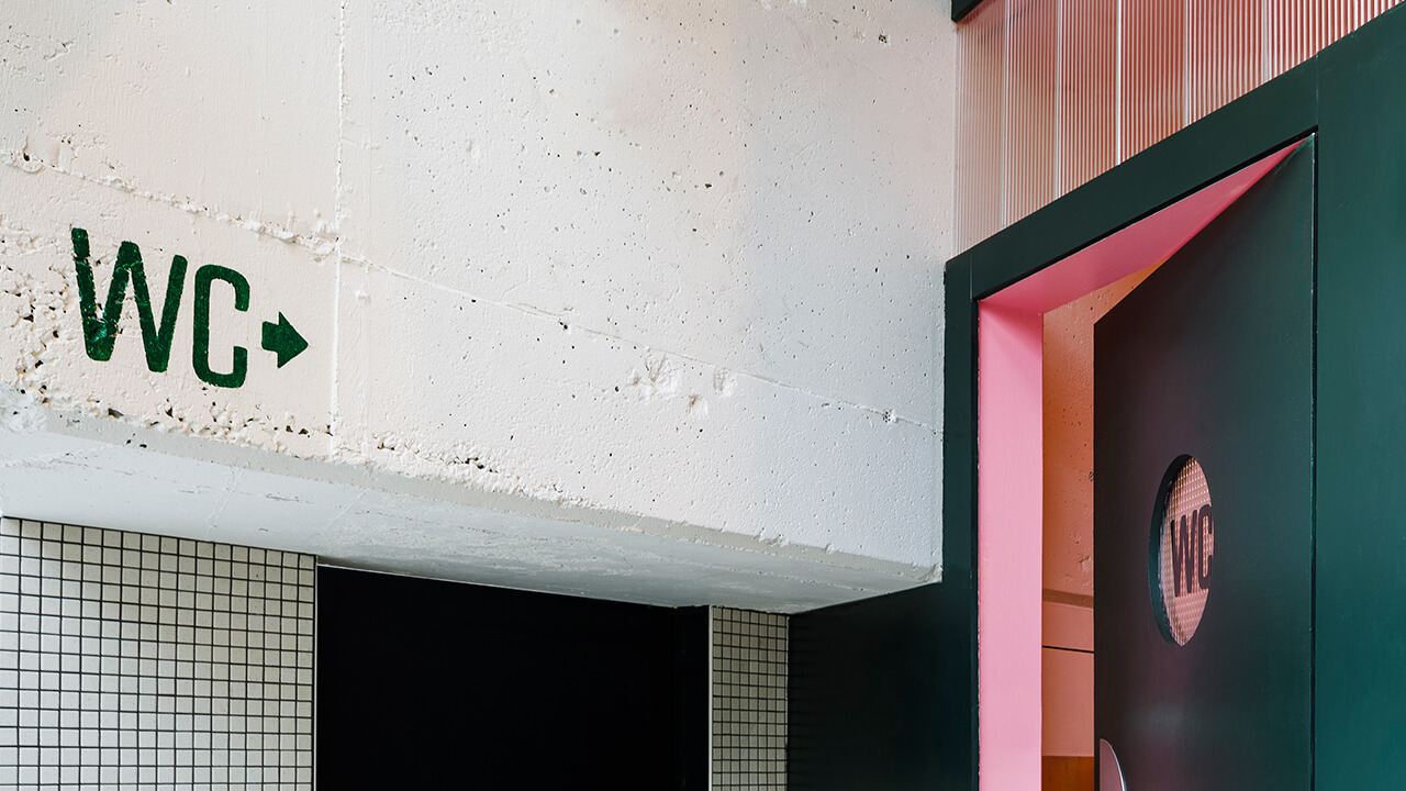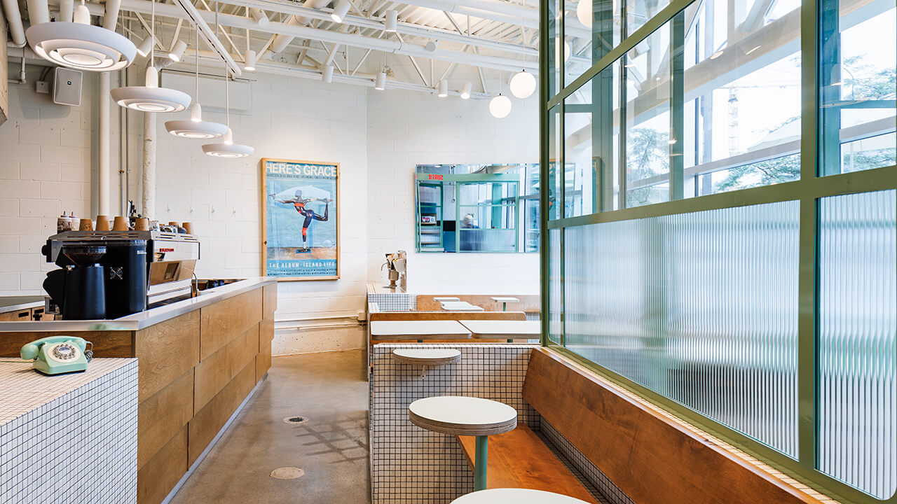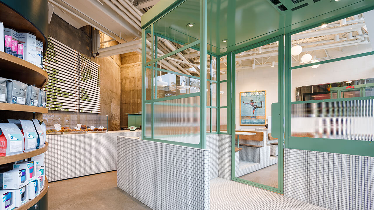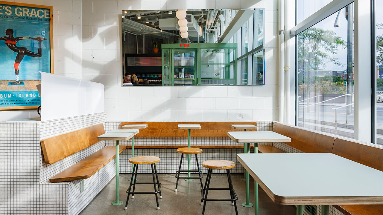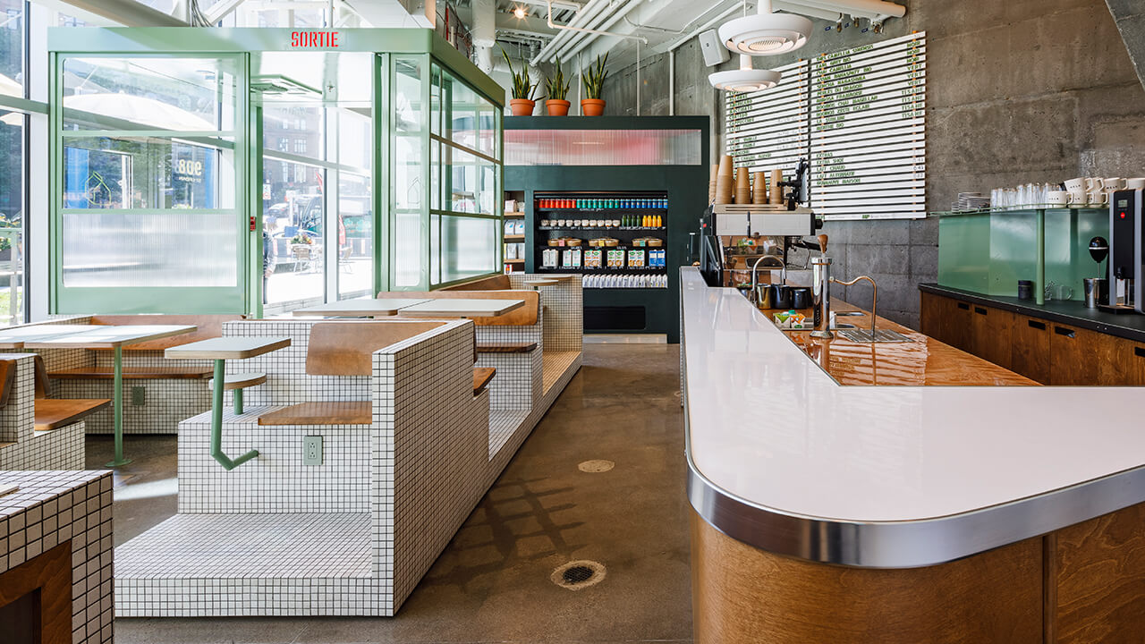 Nous apprécions particulièrement le souci du détail dans l’ensemble du projet, du carrelage de plancher jusqu’à la fabrication des banquettes. L’utilisation minutieuse d’une couleur « signature », le vert menthe, amène de la vie à l’espace, alors que le bois et le béton ajoutent beaucoup de texture au décor. Chapeau également pour la signature graphique (toilettes, panneaux d’affichage, etc.) habilement intégrée au design du café.