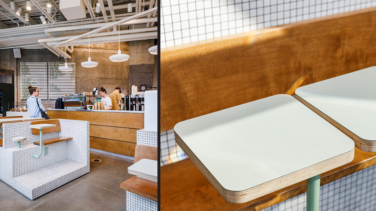 Le mobilier longeant la zone de commandes a été surélevé pour que la clientèle assise se retrouve à même hauteur que celle debout. L’ensemble du mobilier est rivé pour assurer stabilité, constance et cohérence, tout en exerçant sa fonction de délimitation.