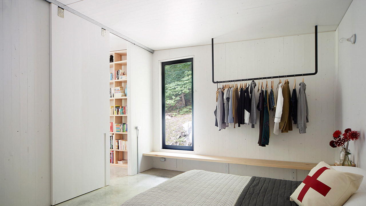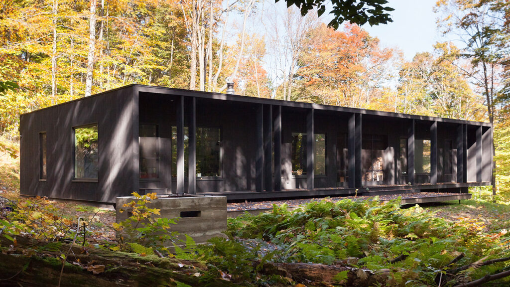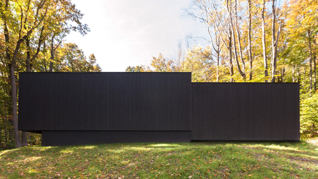 Les clients, citadins assumés, désiraient construire une seconde résidence, en forêt, aux environs de Montréal pour leurs week-ends et vacances. Ils ont alors trouvé un site, sur le flanc Est du mont Pinacle à Frelighsburg dans les cantons de l’Est. Leur demande était simple: un lieu aux espaces largement ouverts sur la nature, construit en structure de panneaux de bois massif (CLT), projetant une image brute, robuste et qui soit simple d’entretien.