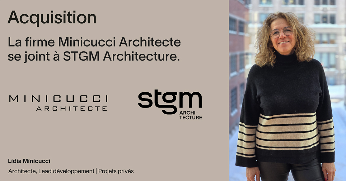 « Montréal, le 5 mars 2025 – Depuis plus de 20 ans, Lidia Minicucci, se distingue sur le marché montréalais en mettant son expertise au service d’une clientèle privée. Aujourd’hui, STGM Architecture est fière d’accueillir l’équipe de Minicucci Architecte, poursuivant ainsi notre croissance stratégique.