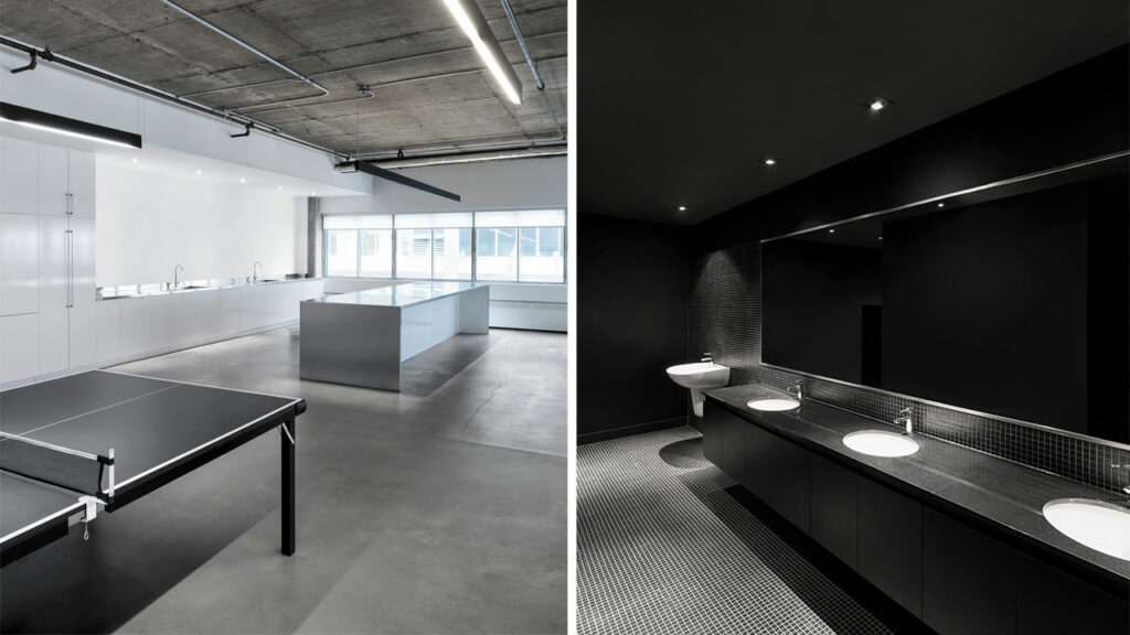 L’espace, ni féminin ni masculin, se divise en 2 grandes zones distinctes. Côté Est, on y retrouve les espaces communs avec sa grande cuisine laboratoire, un air de jeux, une série de tables réfectoire et les espaces lounge. Côté Ouest, un vaste espace ouvert pour accueillir une centaine d’employés, dans un environnement tout blanc est accompagné par un éclairage linéaire très graphique. Une longue bande de bureaux tout en noir, rythme et traverse l’espace, servant de lien et de transition vers les espaces communs. »