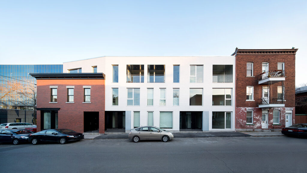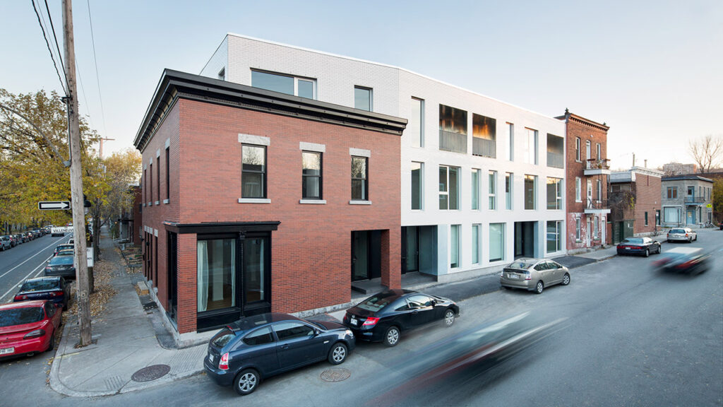 L’un de principaux enjeux de ce projet est la valorisation de l’intégrité des caractéristiques architecturales du quartier tout en y intégrant une facture architecturale actuelle. Pour cela, le maintien de l’implantation des entrées résidentielles sur trottoir, la simplicité volumétrique, l’alignement de la fenestration, le maintien de la proportion verticale des ouvertures et la conservation du caractère unitaire du coin des rues ont été analysés afin d’y apposer une expression architecturale pérenne et respectueuse de son environnement construit. À l’arrière de l’ilot, la volumétrie du projet s’articule autour d’une cour arrière privée afin d’optimiser au maximum son emprise au sol.