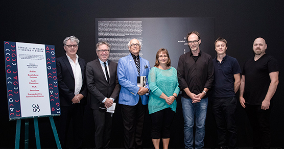 DE GAUCHE À DROITE: Borkur Bergmann, directeur sortant, Centre de design; Claude Provencher, architecte, associé principal et cofondateur, Provencher Roy, et membre du Cercle des artisans; Michel Languedoc, architecte et vice-président grands projets, Ædifica, et membre du Cercle des artisans; Michèle Hébert, secrétaire de direction, Centre de design; Georges Labrecque, chargé de projets d’exposition, Centre de design; Patrick Evans, directeur par interim, Centre de design; Steve Dubé, technicien en muséologie, Centre de design | Crédit : Jean-François Hamelin