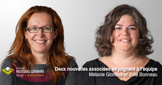 « Montréal, le 21 décembre 2016 — Michel Rousseau et Daniel Lefebvre, associés fondateurs du Groupe Rousseau Lefebvre, ont le plaisir d’annoncer la nomination de Mélanie Glorieux et de Julie Bonneau à titre d’associées. « Près de 30 ans après nos débuts, nous sommes fiers d’accueillir et d’intégrer deux femmes créatives et déterminées au sein de l’équipe de direction. L’expérience et l’expertise qu’elles ont développées permettront d’élargir les visées de la firme et de la faire rayonner davantage. »