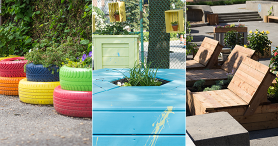 DE GAUCHE À DROITE: Projet de bacs à fleurs des élèves de 5e année de l’école Henri-Beaulieu | Projet d’espace de détente des élèves de 5e année de l’école Nesbitt | Poursuite du projet de réaménagement d’un îlot vert par les élèves de la classe FPT (formation préparatoire au travail) de l’école Saint-Henri | Crédits photos: Thierry Bossé