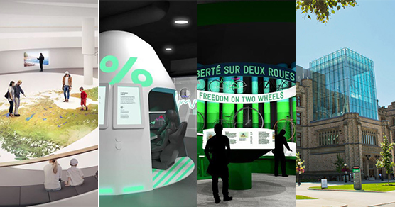 DE GAUCHE À DROITE: Hub, vue de haut (axonométrie), CHH (Crédit: GSM Project) | Interactif : « atterrir dans les 2% », Banque du Canada (Crédit: GSM Project) | Galerie « En pleine nature », « Liberté sur deux roues » (Crédit: GSM Project) | Photo extérieure du Musée canadien de la nature (courtoisie)