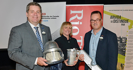 DE GAUCHE À DROITE: Carl Dufour, Président de l’arrondissement de Jonquière, Lucie K. Morisset, Titutaire de la chaire de recherche du Canada en patrimoine urbain, Jean-François Nadeau, directeur général du Complexe Jonquière de Rio Tinto Canada | Photo courtoisie de Rio Tinto.