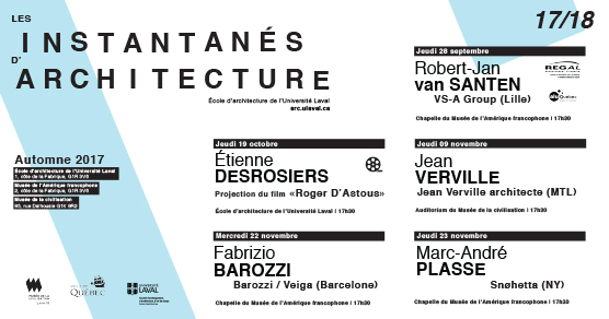 L’École d’architecture de l’Université Laval est heureuse de vous présenter son programme de conférences pour l’automne 2017. Toutes les conférences sont gratuites et ouvertes au public. La série Instantanés d’architecture est une présentation de l’École d’architecture de l’Université Laval en collaboration avec les Musées de la civilisation et la Ville de Québec.