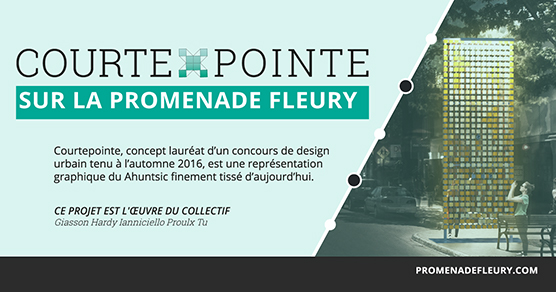 Courtepointe, concept lauréat d’un concours de design urbain qui s’était tenu à l’automne 2016, consiste en une série de douze courtepointes géantes illuminées de 12,5 pieds (3,81 mètres) de haut, formées de montants métalliques et de centaines de petits cubes de bois. Ces structures, de par leurs motifs et leurs cubes mémoires, dévoilent chacune un pan de l’histoire du quartier Ahuntsic, et créent un parcours interactif le long de la Promenade.