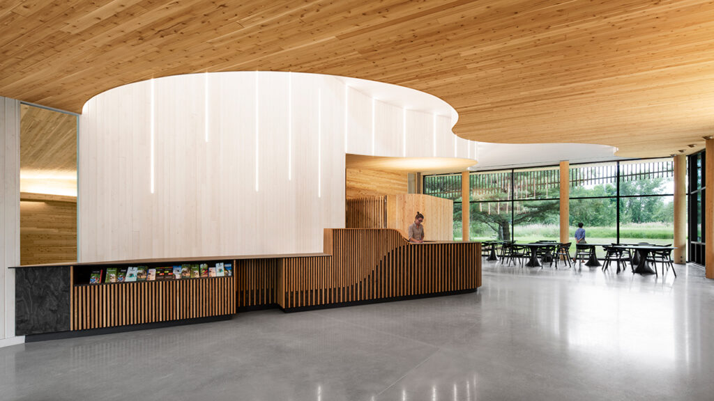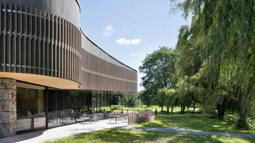 L’architecture respecte et reflète son environnement. Les courbes du bâtiment ont été conçu pour minimiser la coupe d’arbres sur le site et encourage les visiteurs à se promener autour, découvrant progressivement l’espace. Ce mouvement fluide est accentué par un voile texturé : une succession de baguettes de bois couvrant le parement tout autour du bâtiment. Ce revêtement agi également comme filtre de lumière et produit des ombres dansantes au sol, imitant l’ondulation du feuillage des saules. À l’intérieur, un surplomb de plafond dont la courbe rappelle celle du chenal et mène à un puit de lumière, inonde l’espace de lumière du jour et facilite la ventilation naturelle. La composition architecturale s’achève par un mur rideau de verre, offrant des vues sur le parc depuis l’intérieur et reflétant la nature sur le verre teinté à l’extérieur.
