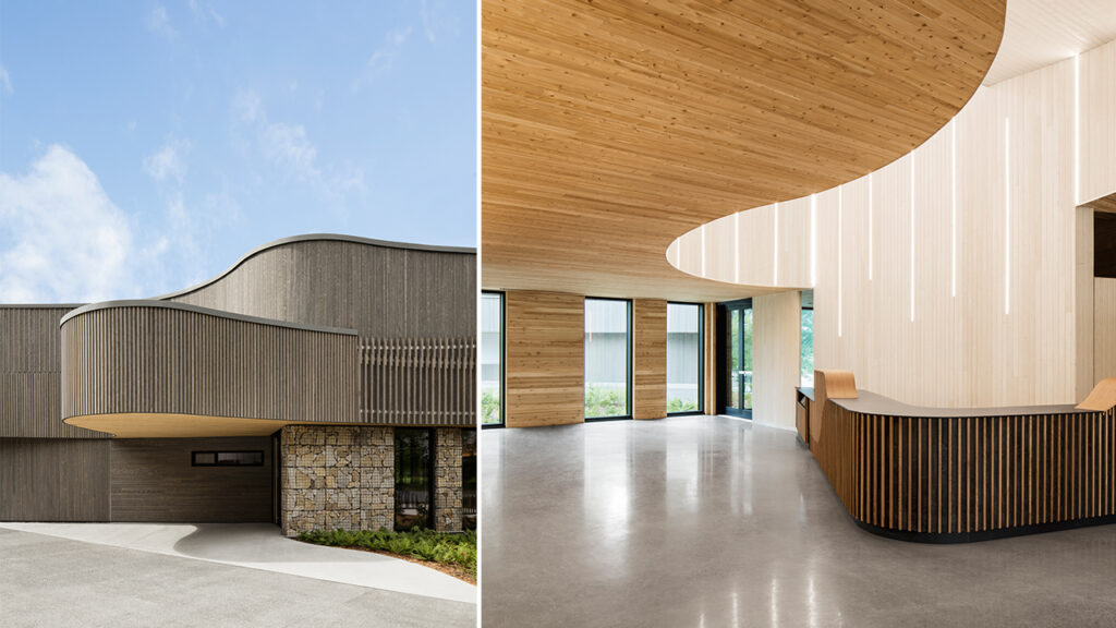 Dès le premier regard, l’équipe de Kollectif a été charmée par l’architecture de ce pavillon qui présente une fluidité désarmante à travers les courbes qui s’enchaînent naturellement à l’intérieur comme à l’extérieur. La matérialité de l’édifice, soit du cèdre de l’est, favorise une intégration très harmonieuse avec le contexte avoisinant, tout en apportant beaucoup de chaleur et de texture au design intérieur. Chapeau également à la maximisation de la ventilation naturelle, qui devrait permettre de réduire de 40% la consommation d’énergétique du pavillon.
