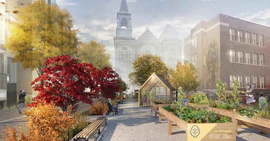 «Le Parvis des Champs vise à célébrer le cœur de ce quartier chargé d’histoire et en plein renouveau, en l’offrant à la communauté qui lui donne vie. Le Parvis se développe en une entité vivante qui évolue et se transforme au gré des saisons.