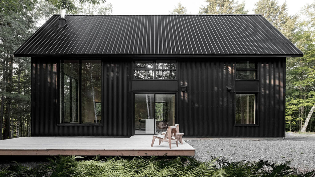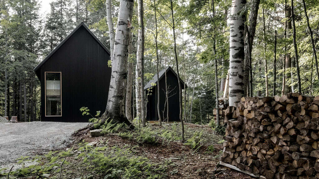 La forme générale des pavillons s’inspire des bâtiments au langage vernaculaire qui ponctuent les paysages de l’Estrie. La matérialité extérieure monochrome permet la mise en valeur de la simplicité et de l’efficacité de cette architecture traditionnelle. Le revêtement métallique noir présent aux murs et en toiture qui se fond bien dans la forêt contribue à la sobriété du projet. Sur les façades extérieures, les seuls éléments qui contrastent sont le pourtour de la grande fenêtre verticale du côté est et la poignée de la porte d’entrée côté nord. Ces deux éléments en cèdre créent des points focaux vers le projet qui reprennent et soulignent la verticalité omniprésente des troncs d’arbres sur le site.