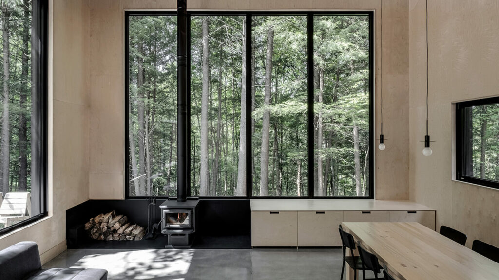 La première maison, ou la première frontière, devient donc la forêt, le chalet lui, est vu comme une pièce qui prend place dans cet ensemble. Les ouvertures ont été conçues pour offrir une relation unique et saisissante avec le site. À certains endroits, on peut admirer l’impressionnante verticalité de la forêt, alors qu’ailleurs on aperçoit des scènes plus horizontales vers une végétation luxuriante. Les occupants peuvent donc contempler le tableau changeant que leur offre la forêt au gré des saisons.