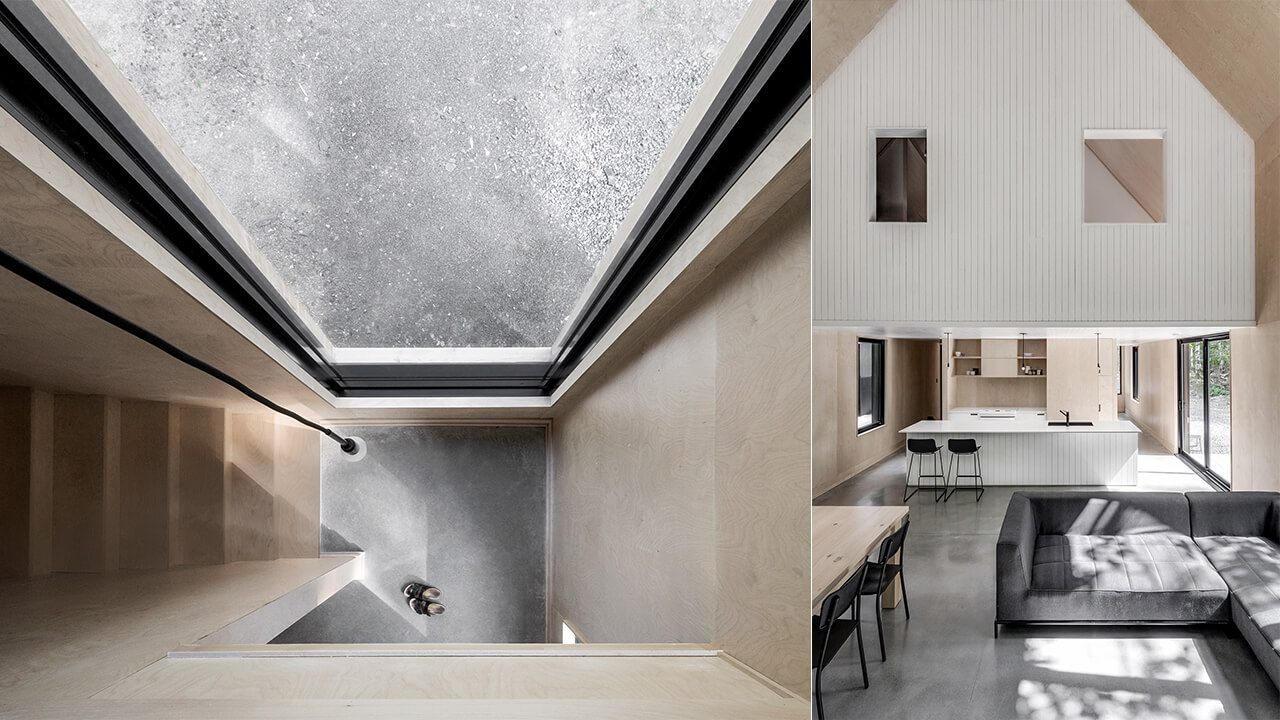 Le plan intérieur s’organise autour d’un noyau technique qui libère les espaces de vie et permet un aménagement à la fois minimal et convivial. Au rez-de-chaussée, les cloisons ont été traitées de façon minimale afin de libérer les espaces de vie. Les éléments plus techniques ont pour leur part été concentrés dans un noyau central autour duquel on peut circuler. La cuisine, partiellement intégrée au noyau, profite d’un grand espace de rangement. Au deuxième étage, le noyau central se prolonge, cette fois-ci en zone de dortoir pour les invités. Des ouvertures intérieures qui donnent sur les espaces du rez-de-chaussée rehaussent l’entrée de lumière et créent un lien entre les deux niveaux.
