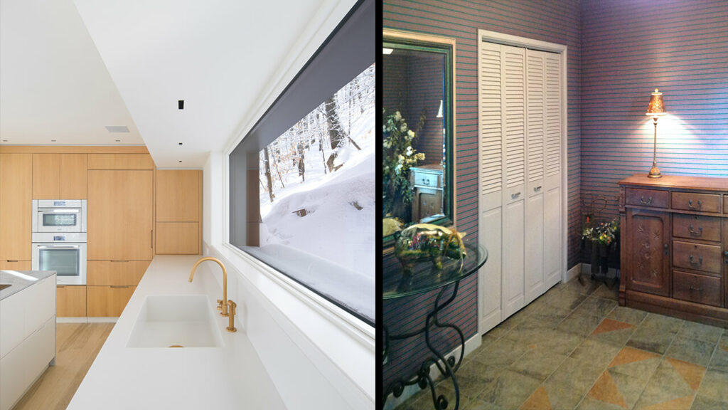 La transformation de cette résidence est époustouflante et sensible – c’est pour cette raison que le montage photo est important afin de démontrer l’approche « chirurgicale » dans les interventions architecturales. Mais cette transformation ne s’est pas faite en dépit du projet existant, bien au contraire: la qualité de ce projet réside dans son attention aux caractéristiques originelles du bâtiment (ou de ses « racines » scandinaves) afin de les valoriser. Détail intéressant que nous avons également apprécié: le fait que la transformation a été mandatée par les propriétaires existants. Cette volonté des propriétaires de non seulement rénover, mais également d’adapter leur résidence pour les années à venir démontre un réel attachement au projet et au site.
