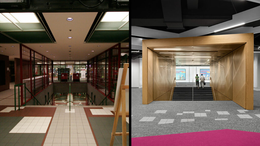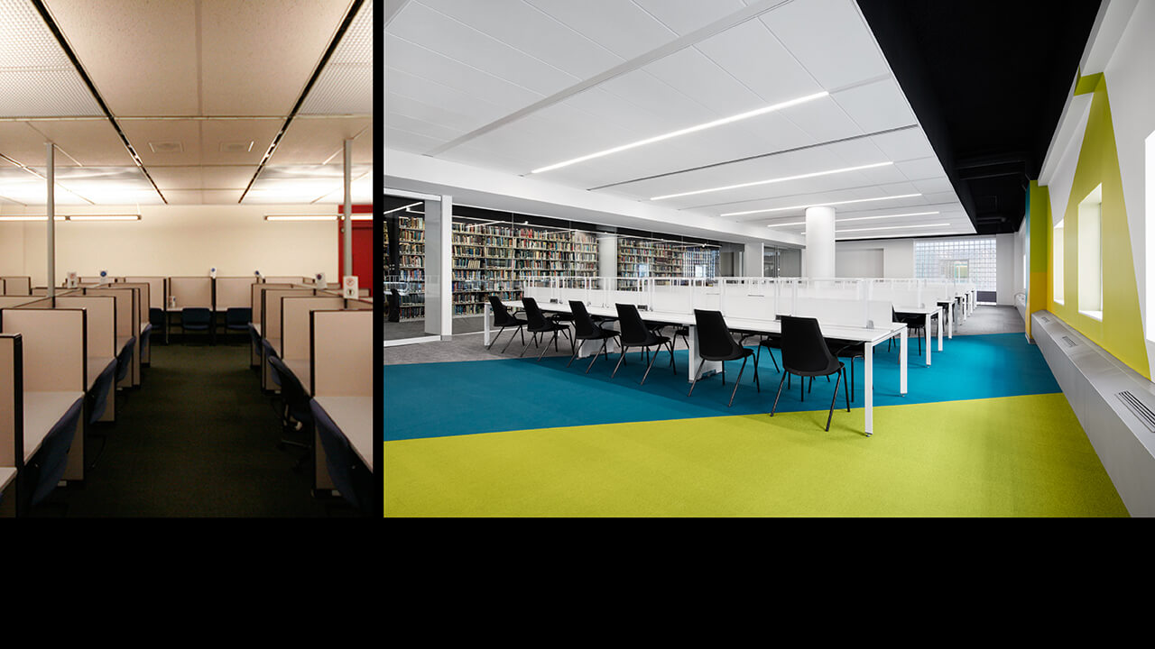 La métamorphose de la bibliothèque Webster de l’Université Concordia a retenu notre attention sur de multiples facettes. L’équipe de MSDL a su brillamment réinventer un espace glauque et désuet en lui offrant une toute nouvelle personnalité, franchement bien adaptée aux besoins actuels de la communauté universitaire. Les photos « avant-après » ci-dessous en témoignent largement, ayant notamment réussi à « agrandir » par l’intérieur chaque étage de la bibliothèque grâce à une refonte complète des lieux. De la conception des mains-courantes jusqu’aux rayonnages, en passant par la diversité du mobilier, un souci évident du détail transparaît dans les 22 écosystèmes proposés, démontrant l’ampleur de la réflexion architecturale. Cette réalisation a de quoi inspirer la rénovation éventuelle de nombreux bâtiments de notre patrimoine moderne.