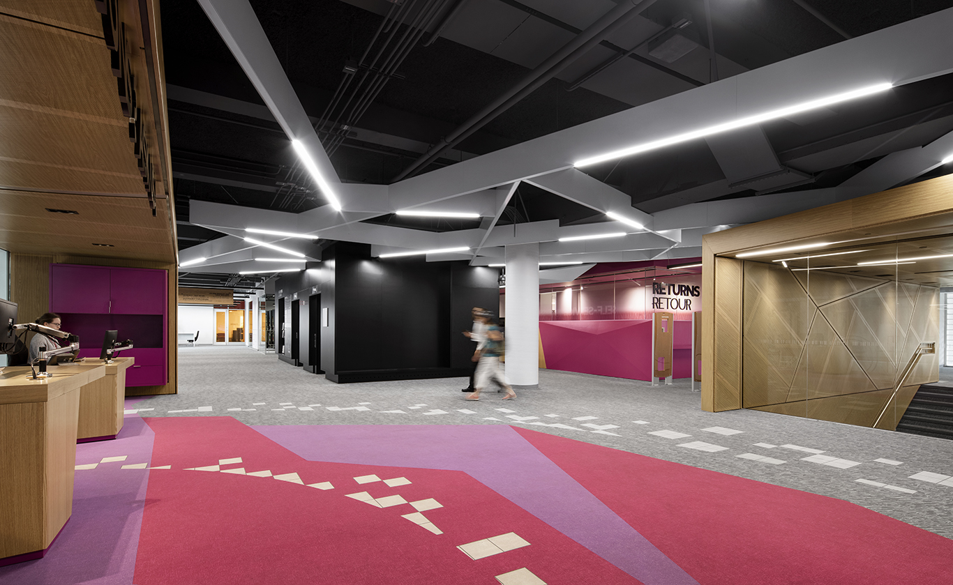 L’approche conceptuelle élaborée par les architectes a permis une stratégie claire quant à l’organisation des collections et des parcours des usagers. Jouant sur le thème de l’anamorphose, le projet propose un réseau complexe de lignes et d’aplats de couleurs qui interpelle l’usager sur ce qu’il perçoit et qui lui suggère que la connaissance et le savoir sont construits à partir d’un point de vue individuel. La nouvelle bibliothèque est à l’image du savoir en évolution et de l’apprentissage actif comme nouvelle façon de partager la connaissance.