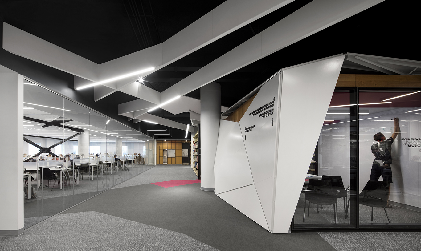 Ainsi, le pavillon abritant la bibliothèque est polychromatique, marqué par l’utilisation de multiples trames de finis. Les finis principaux sont constitués de noir (espaces de rayonnage) et de blanc (espaces de travail individuel) et opèrent une fracture marquant clairement les lieux. Une savante déclinaison de couleurs secondaires signale quant à elle la transition entre les quatre étages du projet.