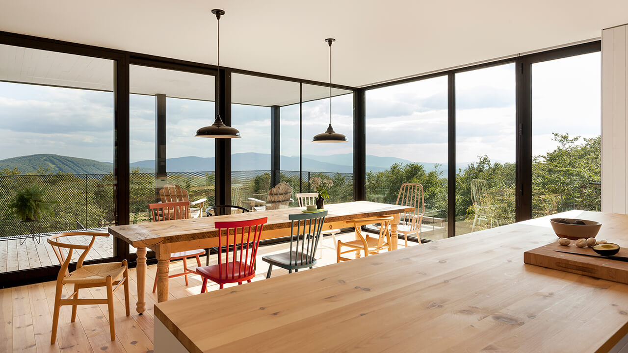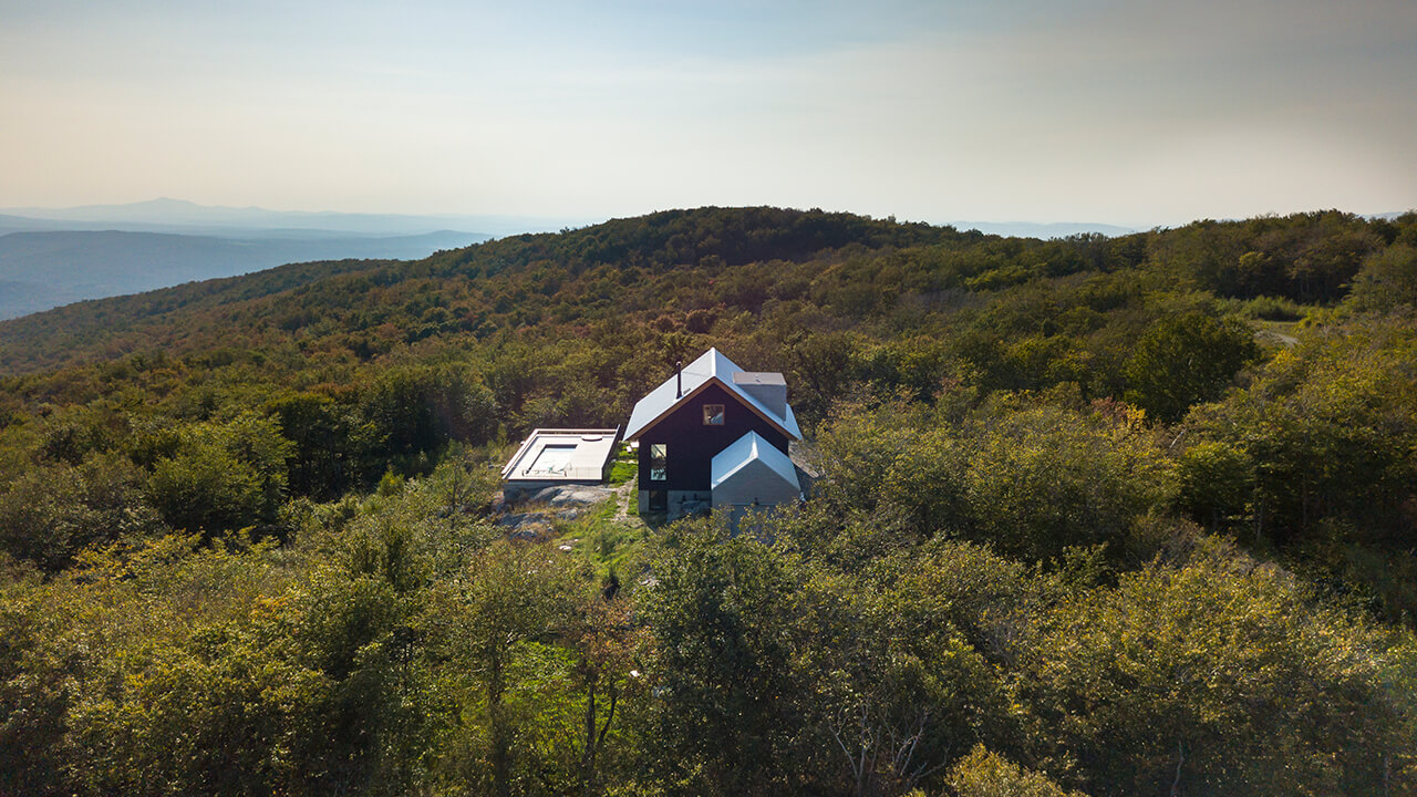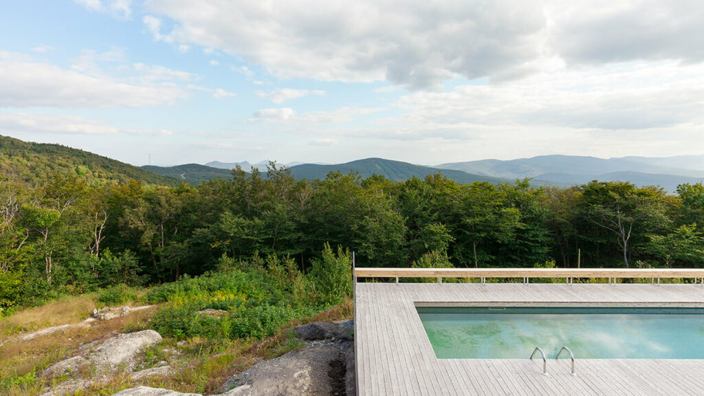 L’une des principales contraintes du projet était le relief inégal du site. Le terrain en pente a obligé un travail rigoureux de mise en relation des niveaux des trois éléments principaux reposant chacun sur une solide fondation en béton : le chalet, plus haut au centre, le garage sur le côté et la piscine en contrebas. En revanche, la vue vers le sud et l’ouest, en direction des Appalaches, est époustouflante en toute saison, et spécialement en hiver, dans cette région qui reçoit beaucoup de neige.