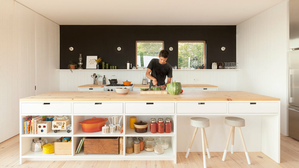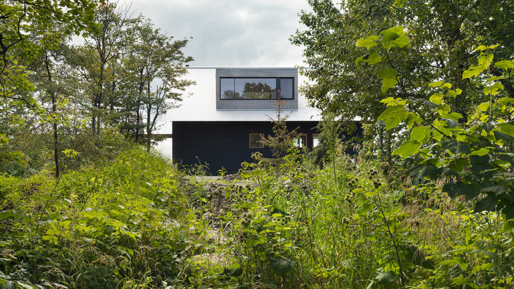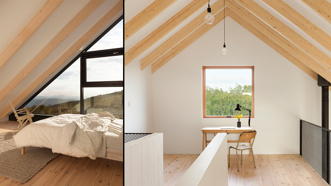 Alors que les très grandes ouvertures à l’arrière ont un cadre noir très contemporain, les plus petites ouvertures des côtés nord et est sont serties de châssis en bois naturel, tout comme la charpente du toit qui soutient la fine surface en tôle ondulée. Ce type de détails, faisant appel à des méthodes de construction traditionnelles, participe encore une fois à l’aspect bucolique de l’ensemble, tout comme la partie en mezzanine au-dessus du salon. La structure apparente en bois se veut une sorte de galerie sur l’espace commun qui permet de créer le toit cathédral, décloisonner l’espace verticalement et donner de l’amplitude à cette pièce de contemplation et de rassemblement.