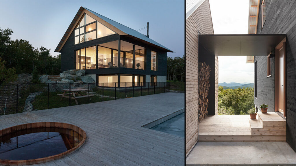Le chalet s’intègre dans un environnement montagneux et boisé en reprenant l’architecture typique des chalets alpins avec des toits en pente et l’utilisation généreuse du bois. En arrivant sur le site par le côté nord, la forme traditionnelle de la construction avec ses petites ouvertures et sa toiture en tôle ondulée incarne le chalet traditionnel, une image très forte dans l’imaginaire collectif québécois. Alors que l’on découvre les faces dirigées vers le sud et l’ouest, les immenses ouvertures, l’assemblage élégant de matériaux modestes et les détails épurés confèrent un esprit contemporain à l’ensemble. De loin, on le confond avec un chalet traditionnel; de près, les détails architecturaux raffinés trahissent l’aspect traditionnel de l’ensemble.