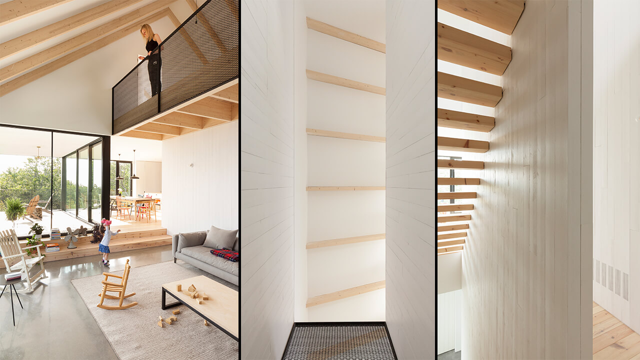 Les planchers en pin et la texture très nouée de cette essence de bois sont un exemple du choix de matériaux qui ont permis de donner son caractère rustique au projet. Un équilibre entre rusticité et modernité est constamment en œuvre. Par exemple, les marches en pin massif de l’escalier flottent entre les deux parois blanches en planches texturées. Un système d’ancrage complètement caché dans l’épaisseur de la marche permet une absence de contremarches et une infiltration de lumière naturelle dans cet espace étroit.