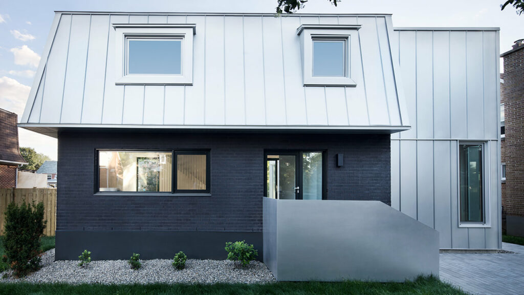 L’élément le plus marquant du pavillon original, sa toiture mansardée, est recouvert d’un parement métallique aux teintes argentées, repris pour le revêtement de l’agrandissement. La ligne du toit est prolongée le long de la nouvelle façade.