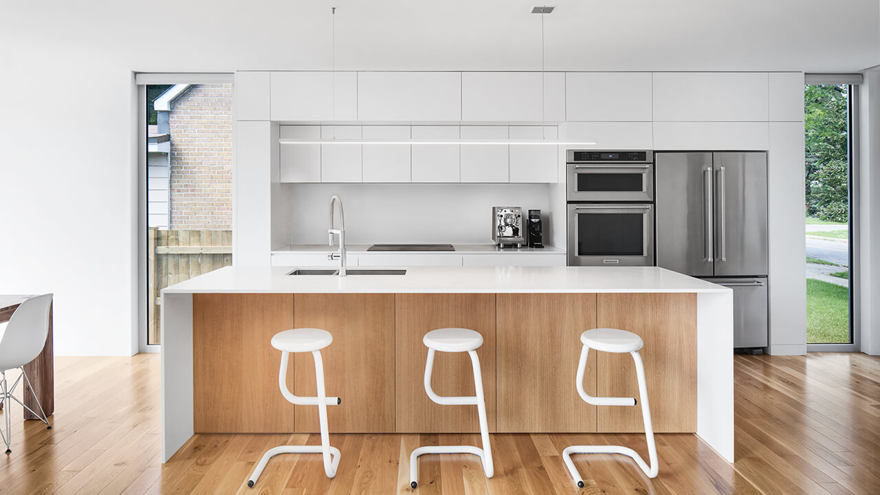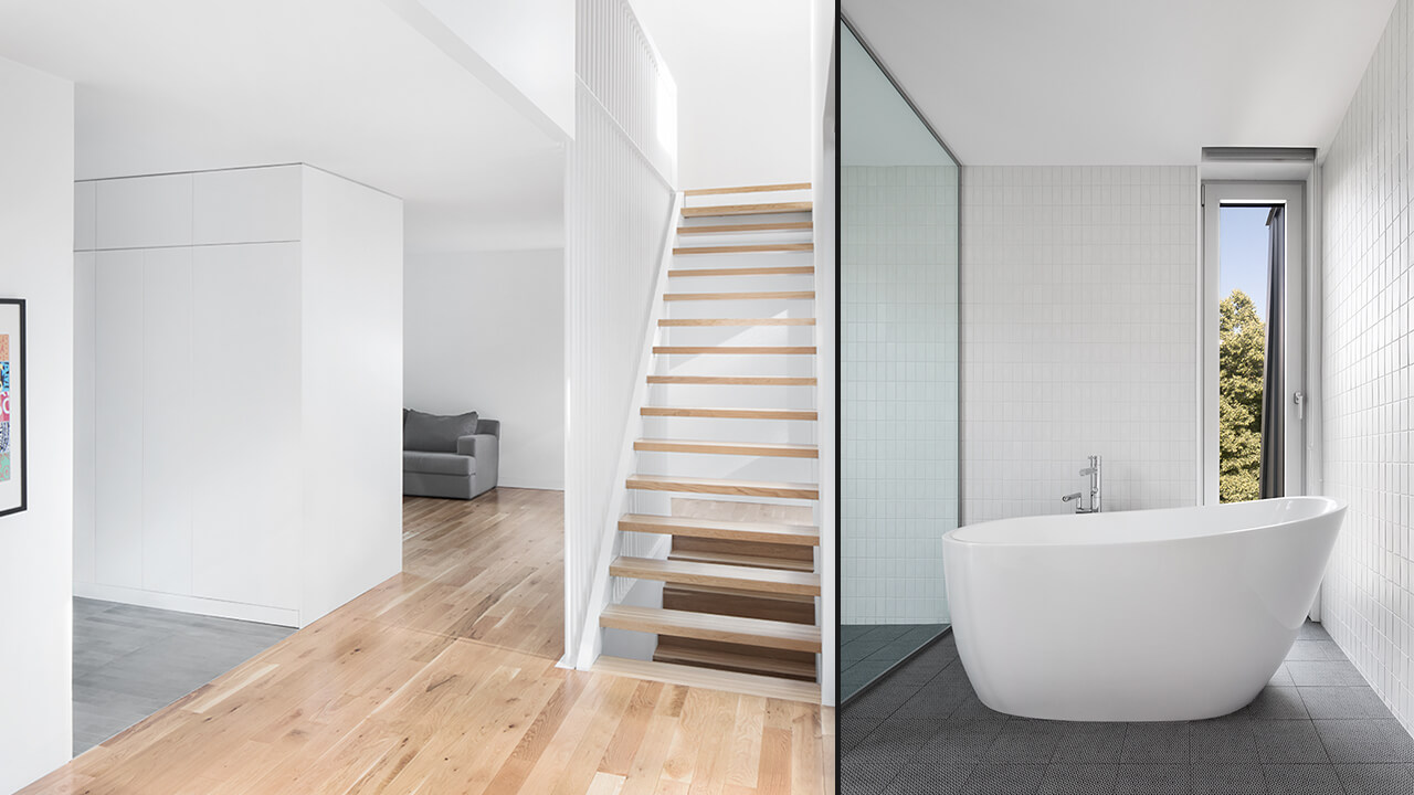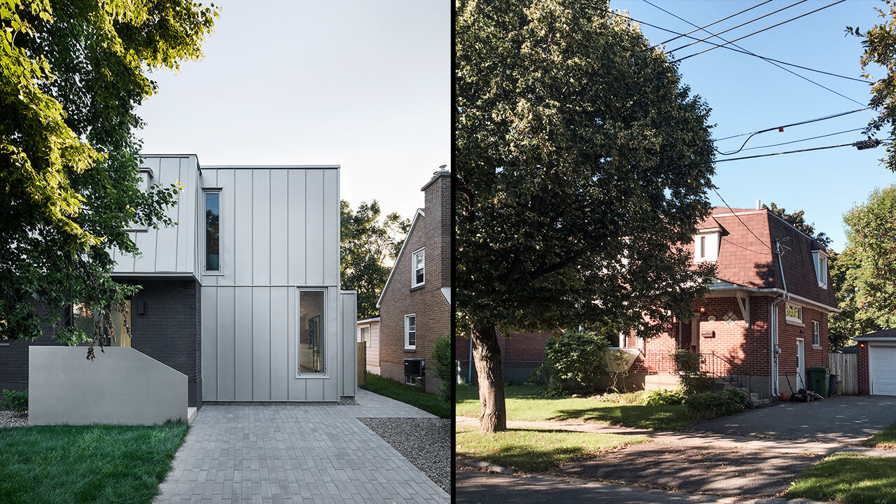 C’est donc à partir de cette excellente base que Microclimat a réussi le défi de respecter le patrimoine environnant et intrinsèque de la maison d’origine de type Gameroff tout en lui conférant un air définitivement contemporain. L’apport de lumière naturelle et l’attention aux vues extérieures sont grandement appréciés tout comme le jeu de volumétrie de l’agrandissement qui ne rentre pas en compétition avec la typologie originale, mais la met plutôt en valeur. Les espaces intérieurs sont simples sans être simplistes, en faisant usage d’une palette neutre accentuée de bois.