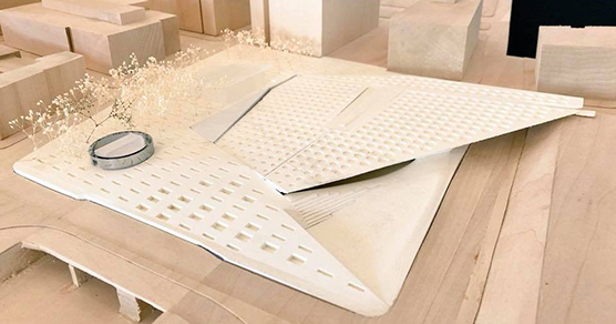 « Deux topographies radicalement différentes se fusionnent en un lieu de convergence. Un plan incliné flotte au cœur du site et constitue le mouvement déterminant auquel vient s’ancrer le concept. Ainsi, une prairie flottante et oblique se dépose délicatement sur une topographie complexe et onduleuse. De cette convergence émerge un système complexe de relations spatiales où s’impriment les lieux de commémoration pour les femmes Montréalaises. À travers ces deux strates, un dialogue se construit entre le dessous et le dessus de la Ville créant de nombreux moments intimes et espaces évocateurs, rappelant les subtilités montréalaises, la place de la femme au cœur de l’évolution de la ville et célébrant l’enthousiasme du citoyen qui découvre son histoire et sa culture.