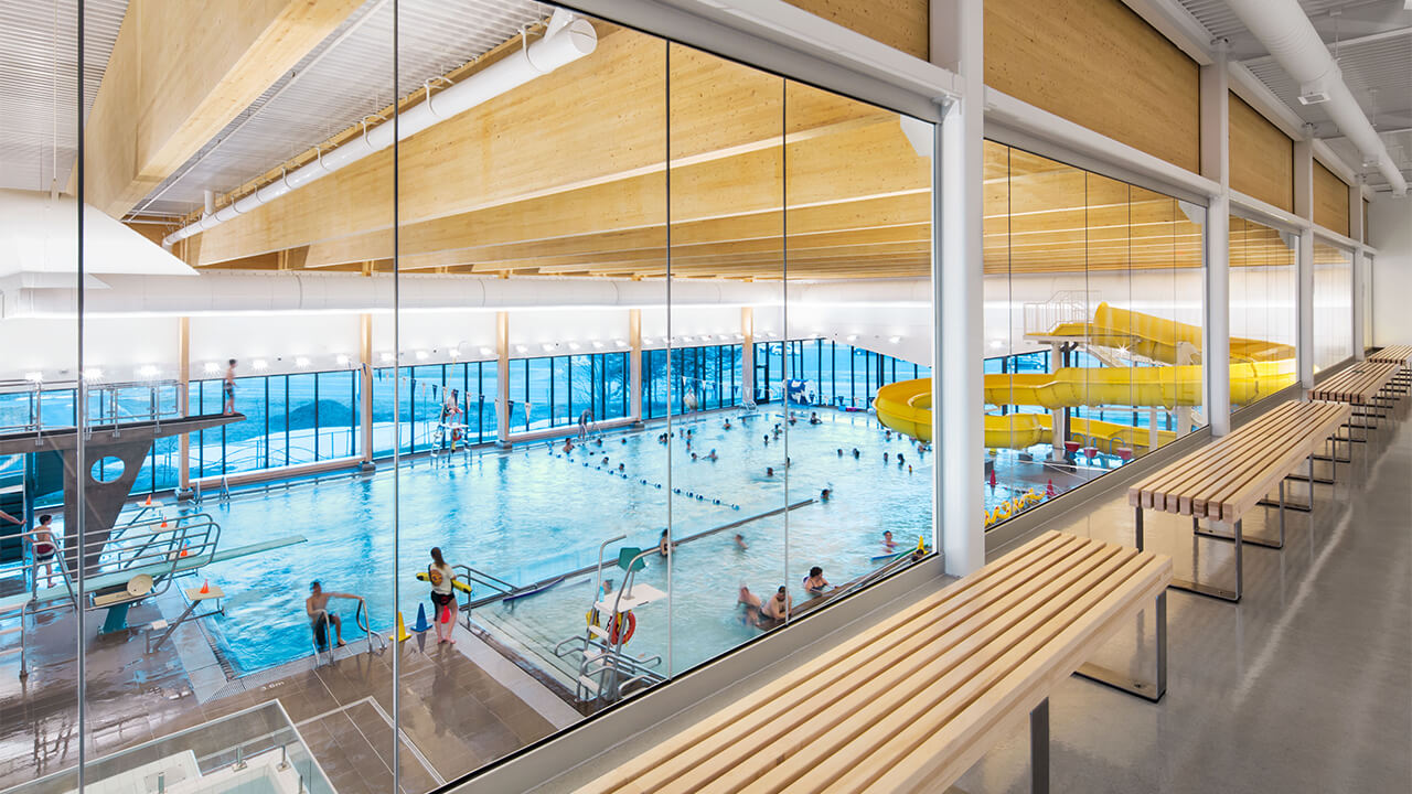 Ce complexe aquatique se présente sous la forme de deux volumes d’échelles et de couleurs contrastantes. Un premier, de couleur anthracite, abrite un bassin aquatique semi-olympique où se déroulent les activités sportives, de loisirs et de détentes visant une clientèle multigénérationnelle. De nombreux équipements connexes, dont des tremplins et plateformes de plongeon, hammam, spa, glissade et jeux d’eau y sont présents et contribuent à en faire un lieu adaptable et flexible en regard à la diversité de la clientèle desservie. Une aire d’observation linéaire vitrée située en mezzanine et surplombant le bassin complète le programme de cette portion du complexe.