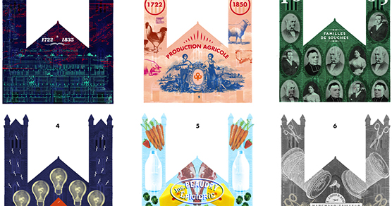 Sur le plan architectural, à lire les commentaires du jury, ce sont Ouellet et Laferrière, deux diplômées en licence graphique de l’UQAM, qui ont réussi à montrer le plus de cohérence avec la façade de l’église. Pourtant, sur la planche de la présentation et la vidéo, le défilé visuel ne dessine pas l’aspect architectural de l’église. Sur le plan narratif, le propos s’appuie sur une évolution historique de la ville. Dans la description de leur projet, ce qui pourrait attirer l’attention à travers les mots techniques, ce sont les médias à travers lesquelles ces images sont présentées tels un kaléidoscope ou la technique « stop motion ». Ce qui a permis de distinguer l’équipe lauréate est bien le jeu de la typographie relatant le déroulement temporel, des années et des mots clés qui aident à la compréhension des images. Le fil conducteur ayant été jugé trop peu développé, après la présentation du projet, le nom d’« éclaireurs » a été changé en « historiscope » et beaucoup d’éléments et de formes ont été ajoutés aux idées initiales. »