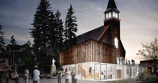Le concept retenu repose sur la préservation du statut patrimonial du bâtiment avec ses valeurs sociales, historiques et culturelles, et ce, sans négliger les valeurs architecturales et paysagères. Le projet proposé est développé selon trois arguments : conceptuel, technique et économique. Au niveau conceptuel, la façade de la nouvelle Agora des Arts sera constituée d’une cage de verre abritant un foyer sur deux niveaux accueillant un grand escalier intérieur, encadré d’un bar en forme de fer à cheval. Cet escalier, rappelant le grand escalier symbolique de l’église, ainsi que le bar seront en bois travaillé. À l’étage, une œuvre de maçonnerie de briques rouges placée devant une paroi de verre irradiera, le soir, une lumière rougeâtre. Cette proposition permettra le maintien de la statue et du paysage avec ses conifères typiques de la nature abitibienne. »