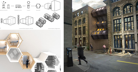 L’équipe gagnante, composée d’étudiants de premier cycle de l’Université Ryerson, a imaginé un design imaginatif qui met à profit les espaces urbains inutilisés en les peuplant de logements abordables fonctionnels et personnalisables. Intitulé In-Between, leur projet utilise des formes hexagonales en nid d’abeille qui permettent l’imbrication de modules pouvant être disposés de manière à répondre aux besoins d’espace et de capacité du site.