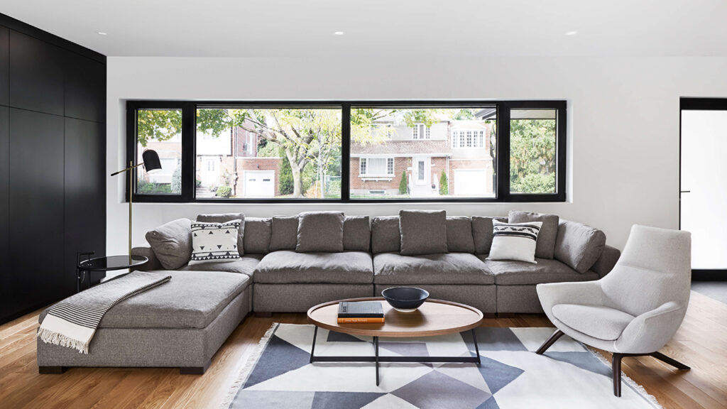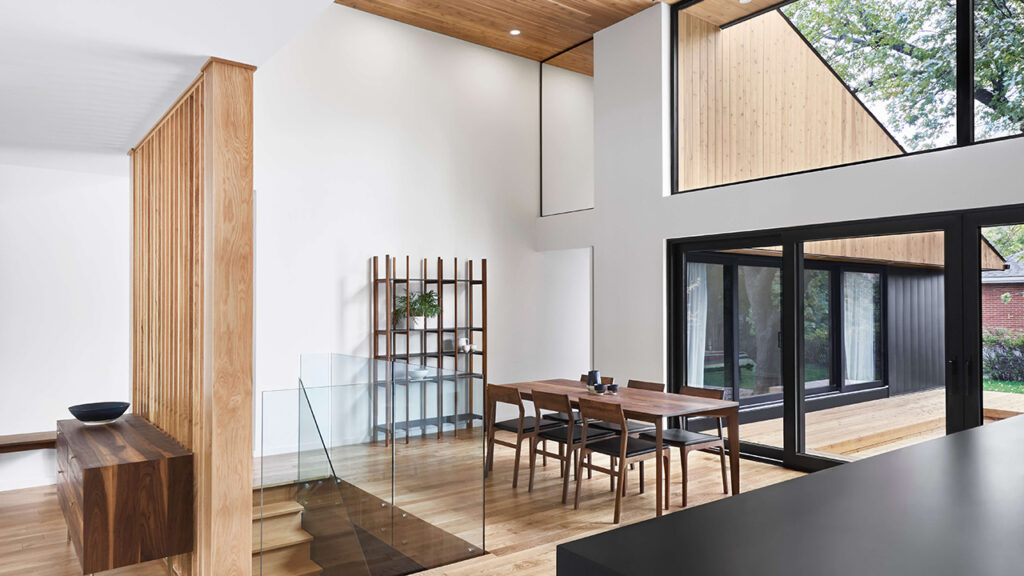En plan, la nouvelle maison prend la forme d’un « L » et est organisée en 3 zones parfaitement ordonnées. Au nord-est, soit de l’avant vers l’arrière, nous retrouvons une enfilade d’espaces intimes et une circulation logique. Les chambres des enfants ont été placées dans la maison d’origine afin de tirer parti des ouvertures existantes et de minimiser les travaux sur les façades. Une nouvelle salle de bain sépare les deux chambres. Suivant ce même axe, la suite des maîtres comprend une salle de bain spacieuse et un dressing, et prend place dans l’agrandissement. Une porte-patio d’une largeur de 20 pieds permet aux propriétaires de profiter pleinement du jardin depuis leur chambre à coucher. Les espaces de vie, qui comprennent le salon, la cuisine et la salle à manger, ont été placés en aire ouverte au centre de la maison. Avec un espace vertical de 15 pieds de hauteur, de généreuses fenêtres du plancher au plafond, de nombreux rangements intégrés et des espaces de vie transformables, ce grand salon invite les membres de la famille à partager des moments uniques, tout en profitant de la lumière et du cadre naturel. Dans la cour arrière, une grande terrasse en cèdre encadre le rez-de-chaussée, permet aux espaces intérieurs de s’agrandir à l’extérieur et donne l’impression d’une maison plus grande.