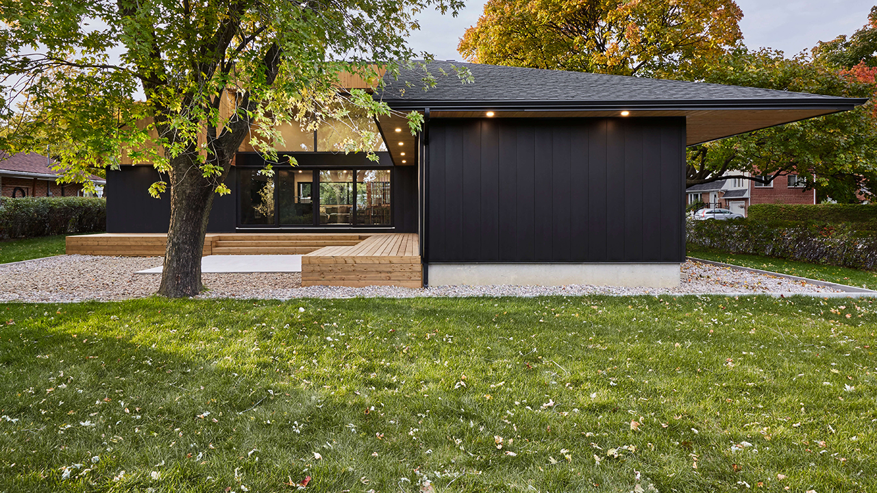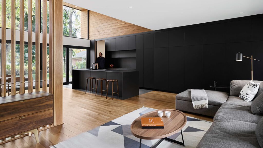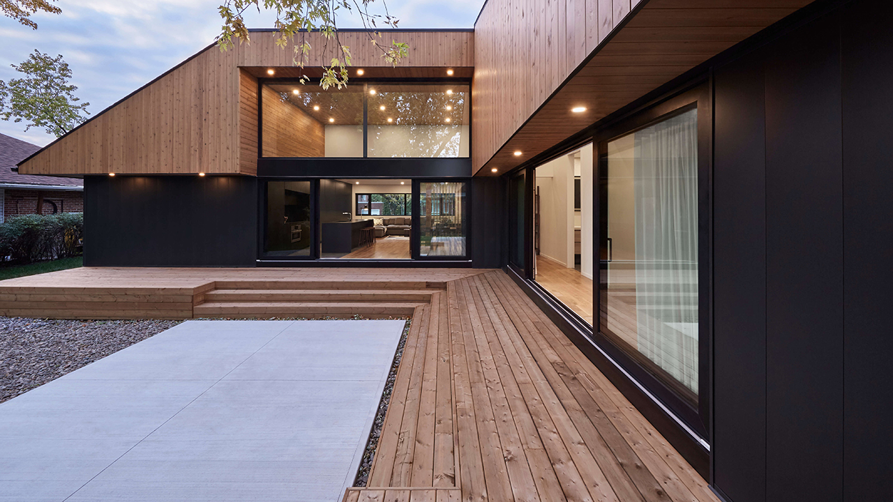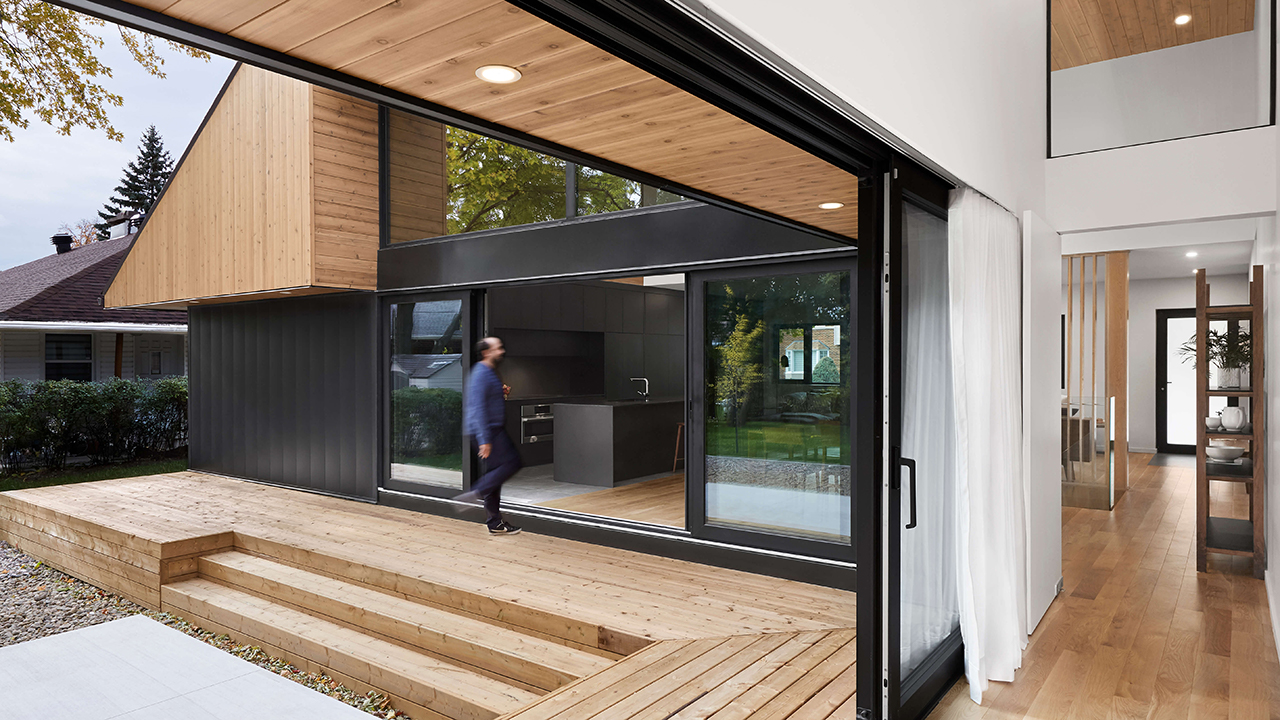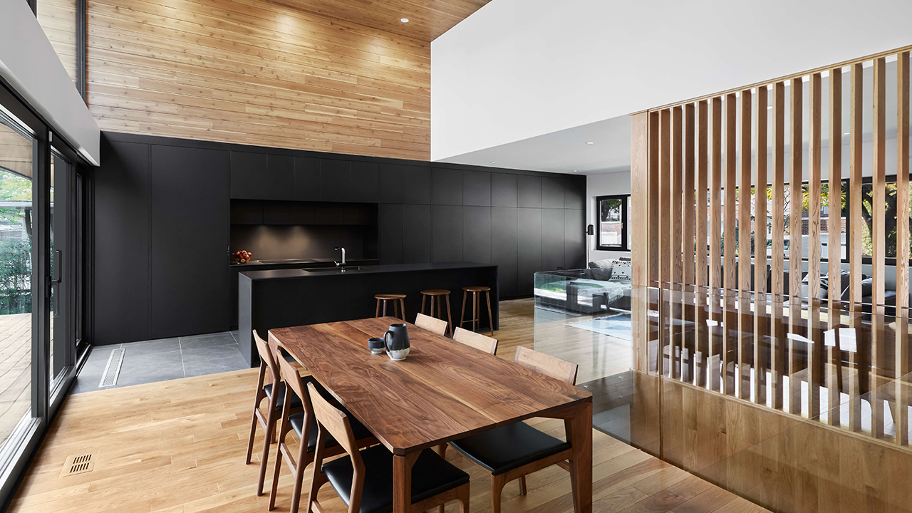 De la rue, l’intervention de la firme MXMA passe pratiquement inaperçue, résultat d’une approche architecturale sensible qui contribue à préserver le panorama urbain du secteur. Mais une fois à l’intérieur et dans la cour arrière, on réalise que le projet, qui visait à métamorphoser une résidence du siècle dernier, présente une signature expressive et audacieuse sur le plan volumétrique. L’heureux mariage entre le verre, le mobilier noir et les textures du bois apporte un équilibre fort agréable sur le plan visuel, tout en générant une ambiance chaleureuse. On a le goût d’y vivre, on pressent le confort familial qui peut y régner.