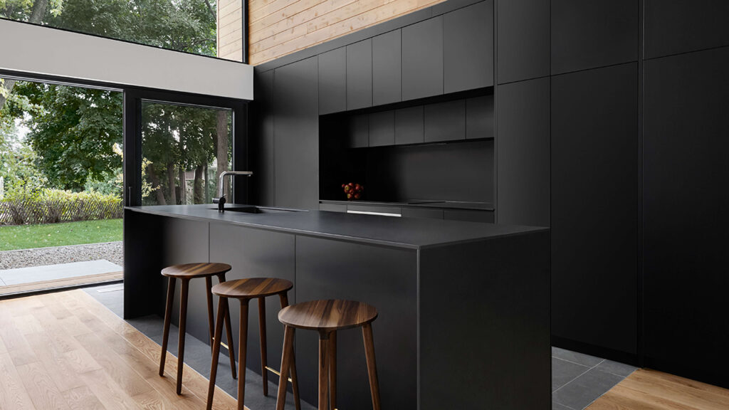 Puisant son inspiration dans la célébration des matériaux, couleurs et textures, la Pearl House présente une cuisine qui contribue fortement au concept énigmatique de la maison et d’un espace ouvert à toute la famille. La coquille de zinc noire qui enveloppe le corps de la maison se replie à l’intérieur en un grand meuble noir pour former la cuisine sophistiquée. Ce geste renforce la continuité entre l’intérieur et l’extérieur. La symbolique du noir, qui représente l’existence et la maitrise dans la culture coréenne, est reprise par le noir profond des armoires, comptoirs et des surfaces de la cuisine. Ce look intégral donne au cœur de la maison l’image parfaite d’un nouveau départ pour les propriétaires. La cuisine contraste avec les sols en chêne blanc et la lumière abondante qui règne dans le grand espace ouvert. Enfin, les multiples espaces de rangements qui répondent aux besoins de la famille sont dissimulés derrière de grandes portes de manière à créer un lieu sur mesure, personnel et un véritable esthétisme minimaliste.
