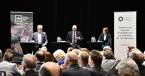 « Montréal, le 11 avril 2019 – Alors que le gouvernement du Québec est en réflexion sur les meilleurs moyens d’octroyer ses contrats publics, notamment en réponse aux recommandations de la Commission Charbonneau, l’Association des Architectes en pratique privée du Québec (AAPPQ) et l’Association des firmes de génie-conseil – Québec (AFG) ont dévoilé ce matin, dans le cadre d’un déjeuner-conférence portant spécifiquement sur cette question, une étude sur les formules qualité-prix actuellement utilisées au Québec et au Canada. Plus de 200 participants ont pris part à l’événement, dont des donneurs d’ouvrage publics des niveaux municipal, provincial et fédéral.