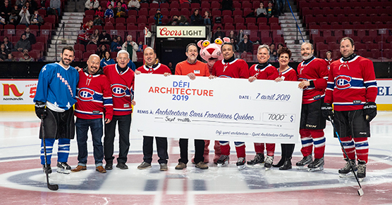 Bénéficiaire d’une partie des fonds pour une deuxième année, Architecture Sans Frontières Québec remercie les organisateurs et tous les partenaires impliqués. Christian Samman, président d’ASFQ, était dans les gradins pour assister à cette journée et prendre part à la remise officielle du chèque à l’organisme : « Cette année encore, c’est un privilège pour le bras humanitaire de l’OAQ d’être l’un des bénéficiaires d’un tel rassemblement alliant hockey et architecture. Les fonds récoltés soutiendront la capacité d’action de notre organisme auprès de communautés dans le besoin. Je ne peux que réitérer notre reconnaissance envers les organisateurs, dont la motivation est véritablement intarissable, ainsi qu’aux joueurs et joueuses, à leurs parents et amis, aux autres spectateurs et aux bénévoles qui ont contribué au succès de cet événement sportif, amical et philanthropique. » »