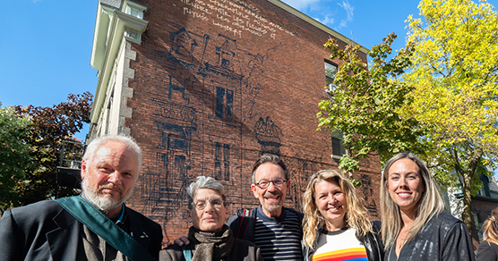 « Montréal, le 8 octobre 2019 – L’organisme de bienfaisance MU inaugurait aujourd’hui une nouvelle murale de sa collection Les bâtisseurs culturels montréalais en rendant hommage à la grande dame de l’architecture Phyllis Lambert. Située au croisement des rues Jeanne-Mance et Milton (3501, rue Jeanne-Mance), la murale est composée de dessins d’observation de façades du quartier réalisés par Dinu Bumbaru, défenseur passionné du patrimoine bâti et grand ami de Madame Lambert.