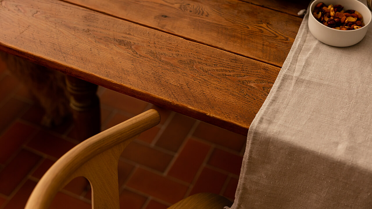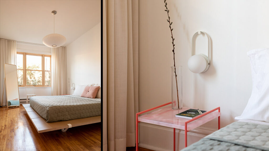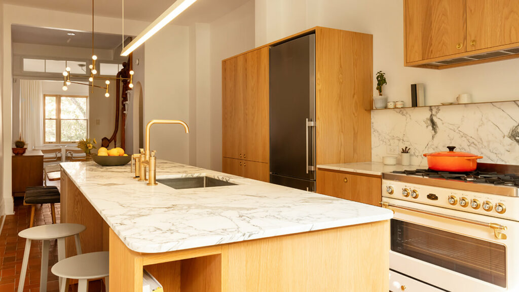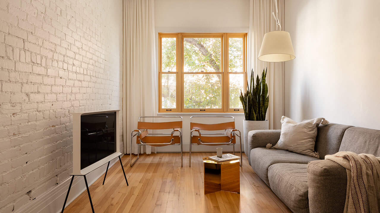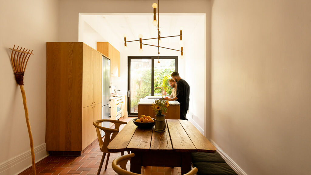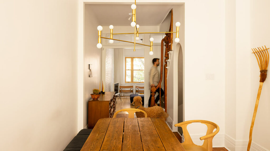 Au deuxième niveau, en arrivant dans le hall de l’escalier, se trouvent un salon lumineux en façade et un grand espace de cuisine et de salle à manger ouvert sur la cour. La cuisine est l’élément central de la maison et elle a été minutieusement pensée pour cet espace très restreint. Les matériaux nobles et très texturés sont mis en valeur par les hauts murs laissés blancs. Le veinage du marbre, le grain du bois, le laiton et le terracotta amènent beaucoup de cachet à travers les lignes simples et épurées du projet; tout est balancé. Le plancher est un clin d’œil à celui de l’origine, ayant dû être remplacé. Les dégagements étant au minimum, tout a été réfléchi dans l’idée de maximiser l’espace; ébénisterie sur mesures, poignées encastrées et électroménagers intégrés. Le choix du mobilier est un mélange d’antiquités d’héritage familial et de pièces coup de cœur scandinave soigneusement choisi par les designers.