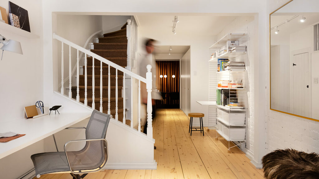 La résidence fut construite en 1885 sur une parcelle résiduelle très étroite située entre deux maisons. À son maximum, la largeur est de 3.1 mètres et pourtant elle donne l’impression d’être vaste avec sa profondeur de 15.2 mètres. Les pièces s’organisent de façon successive de part et d’autre d’un majestueux escalier central. Une rénovation majeure en 1980 a dénaturé beaucoup d’éléments architecturaux datant de l’époque victorienne. La rénovation consiste à ouvrir les pièces afin de faire traverser la lumière, de restaurer les quelques éléments d’origine ayant survécu les époques et d’utiliser des matériaux nobles et intemporels pour assurer la pérennité des interventions. L’idée est de stratifier les espaces de public à privé à travers les étages.
