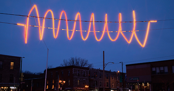 « Montréal, Canada, 4 février 2020 – Présentée jusqu’à la fin du mois d’avril 2020, l’installation élément rayonne dans la nuit, en suspension au-dessus de la Place des fleurs-de-Macadam, sur l’avenue du Mont-Royal, à l’angle de la rue Boyer. Création signée Stéphanie Leduc et Manuel Baumann, élément enveloppe l’espace de sa lumière chaude et organique, et procure une illusion de chaleur.