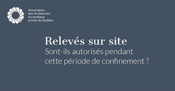 L’AAPPQ considère qu’en l’état actuel de la situation, les mesures strictes de distanciation sociale doivent s’appliquer, conformément aux directives gouvernementales interdisant les activités non essentielles. L’Association recommande donc à ses membres d’éviter les déplacements professionnels chez les clients et sur les lieux des projets, y compris pour effectuer des activités de relevés. Seuls les services et tâches pouvant se faire en télétravail sont pour le moment recommandés. N’oubliez pas qu’en tant qu’employeur, vos obligations en matière de respect des règles de santé et sécurité du travail doivent continuer de s’appliquer, particulièrement dans le contexte actuel.