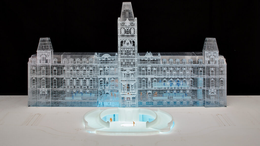 « Le parti de Provencher_Roy a été d’opter pour une intervention sensible et totalement intégrée, en glissant le pavillon sous le paysage existant et en profitant de l’escalier monumental pour créer une nouvelle entrée, vers le pavillon lui-même, ainsi que vers les espaces du Parlement », explique Claude Provencher, Architecte associé principal et cofondateur, Provencher_Roy.